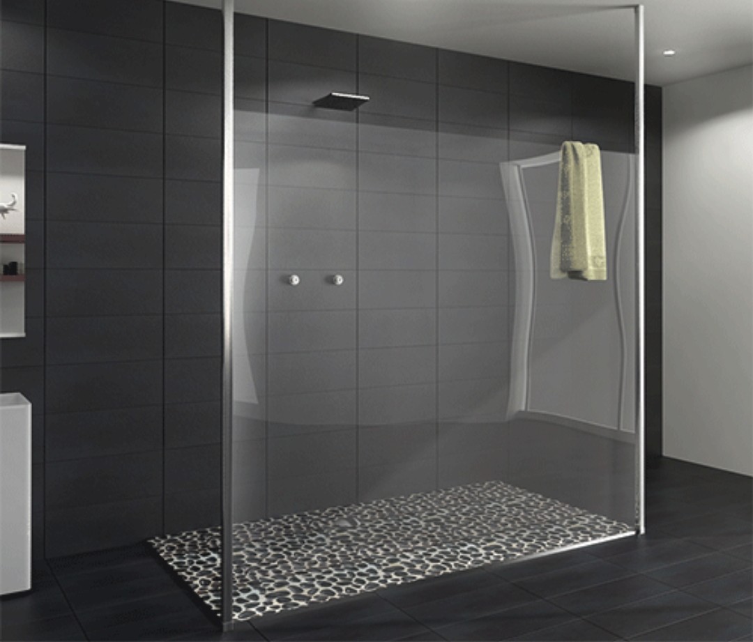 Glazen douchewanden op gewenste maat , inloop douches in strak design afgewerkt in een mooi profiel in inox mat of glanzend van plafond tot vloer of naar wens een stang van douchewand tot muur .